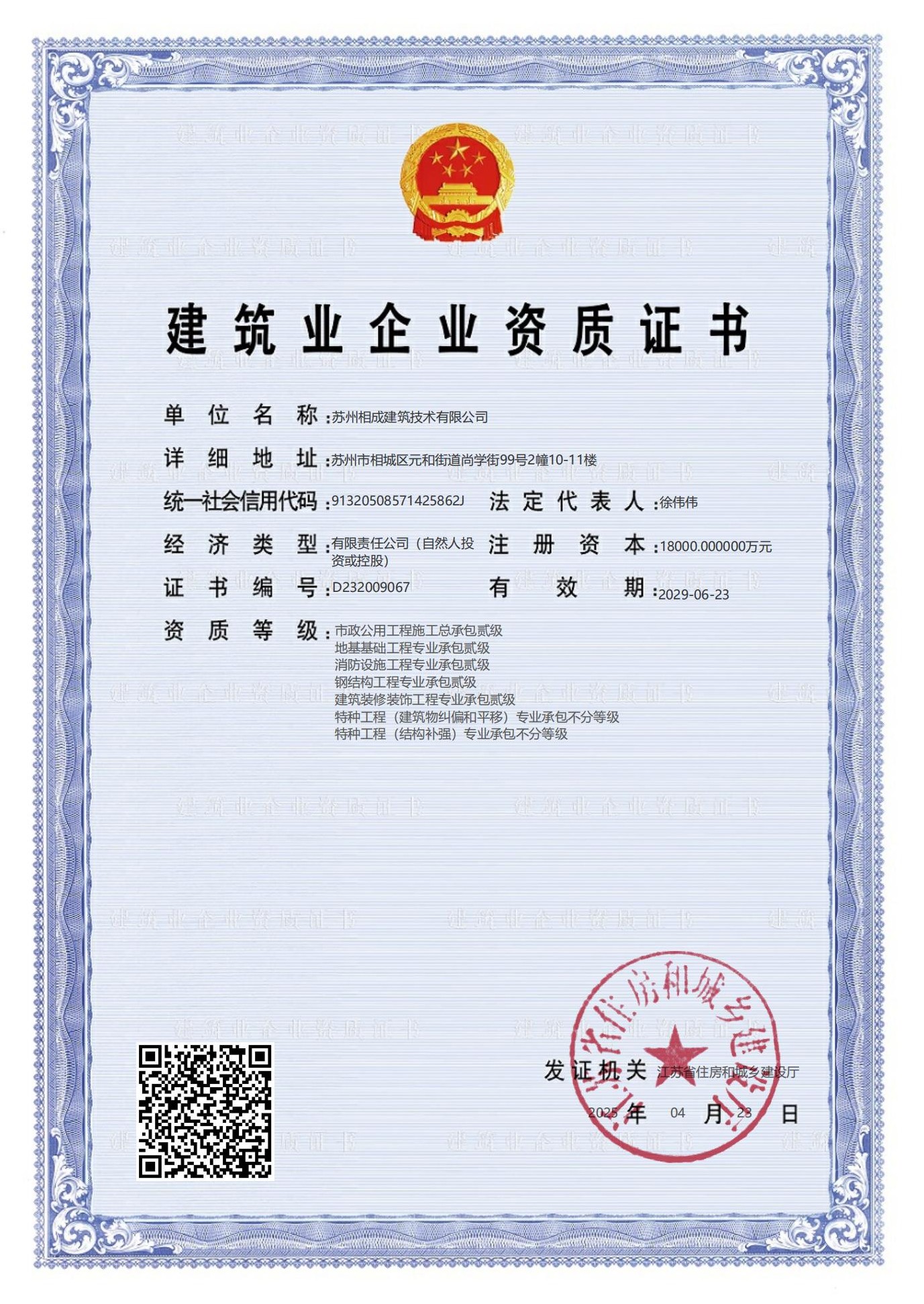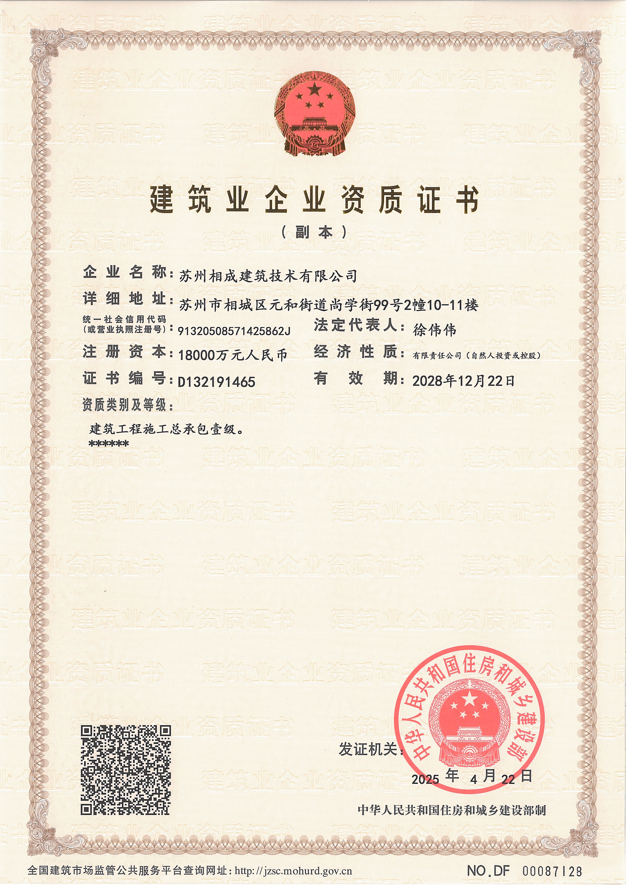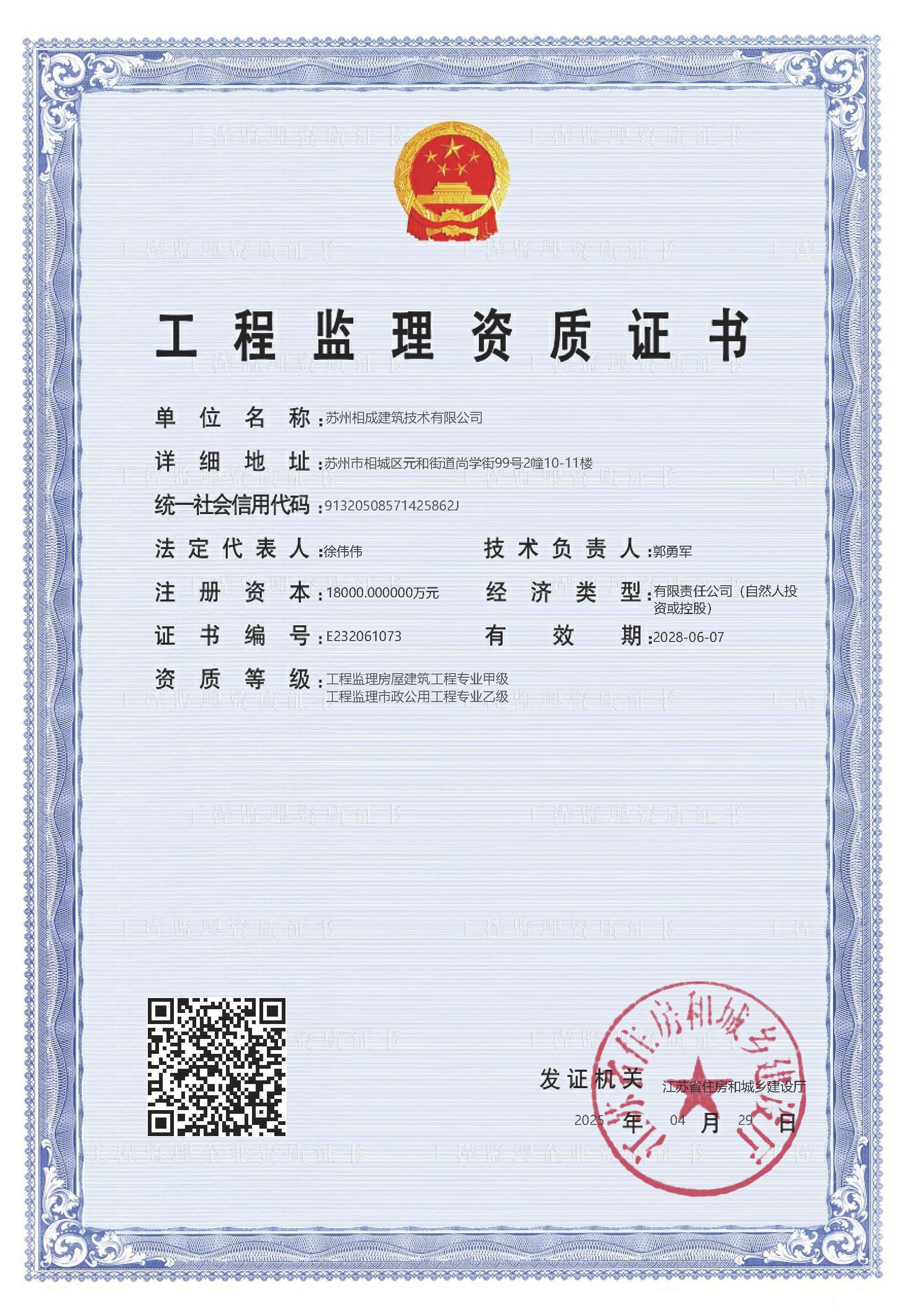 蘇州相成建筑技術有限公司是一家以提供建筑開發(fā)服務為主的建筑企業(yè),公司位于蘇州市相城區(qū),成立于2011年3月,注冊資本 10000萬,歷經(jīng)13年的努力于2022年7月獲省住建廳頒發(fā)房屋建筑工程施工總承包壹級資質(zhì),市政公用、建筑裝飾、地基基礎、消防設施、鋼結構工程等專業(yè)承包二級資質(zhì); 2023 年6月份增設房屋建筑工程監(jiān)理甲級、市政一級監(jiān)理資質(zhì);目前是相城區(qū)唯一一家集施工總承包一級和建筑工程監(jiān)理甲級資質(zhì)的企業(yè)。